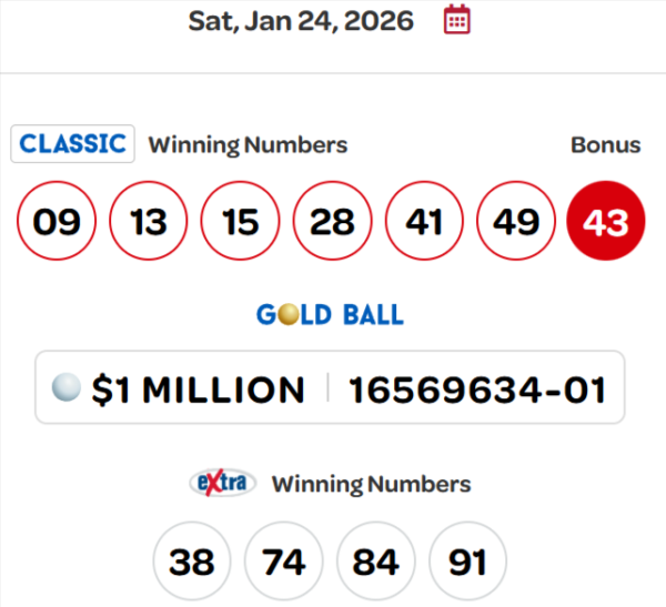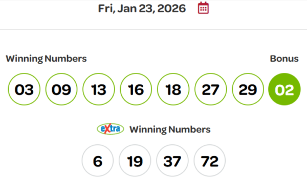 Extra抽奖的中奖号码为38、74、84和91。遗憾的是,没有人能匹配所有号码赢得50万加元头奖。