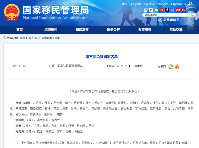 据中国官方公布,目前中国给与单方面免签国共49个,如果中方确认,英国将成为第50国,而不是先于英国访华的加拿大。