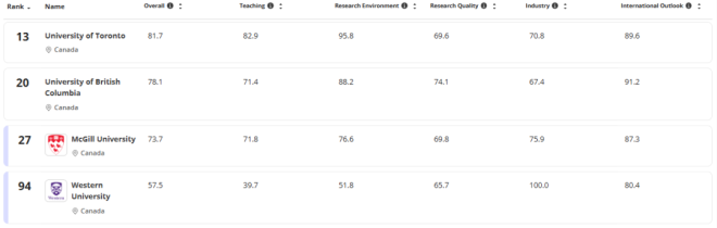 在本次THE学科排名中,加拿大并非只有多大在“发光”。以下是在11个主要学科中进入全球前100的加拿大高校代表: