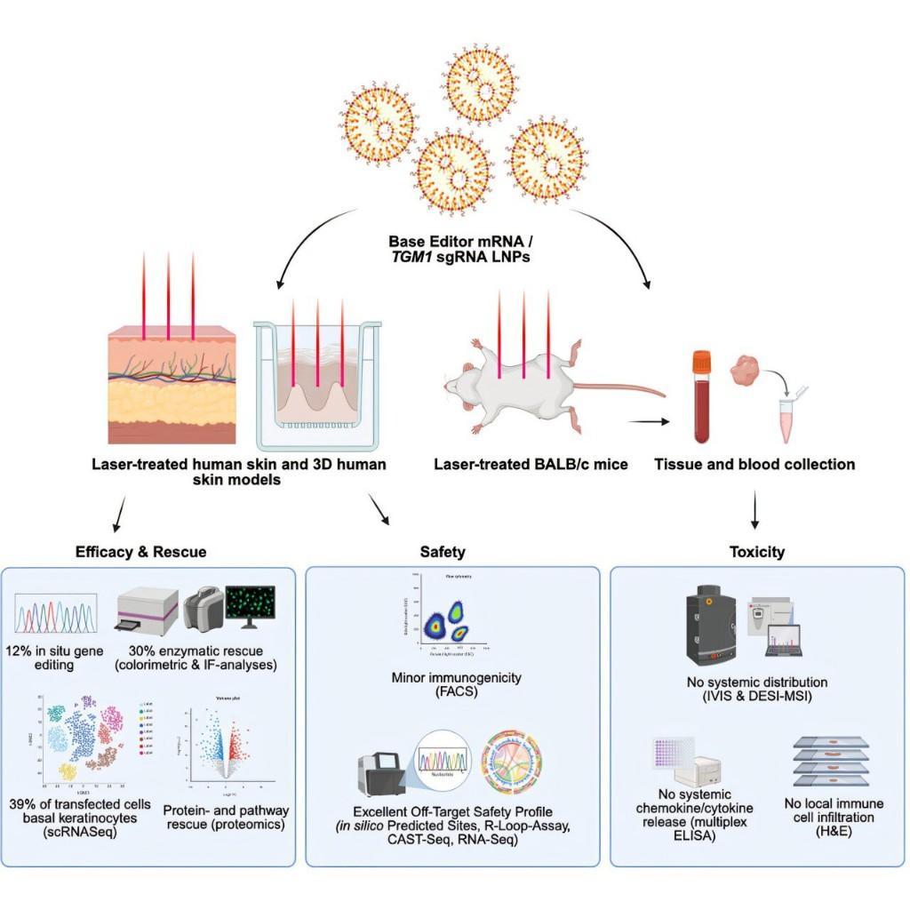 为此,团队创新性地采用脂质纳米颗粒作为“运输车”,搭载基因编辑工具进入细胞。他们先用临床批准的激光,在皮肤表层制造无痛的微米级小孔,帮助纳米颗粒顺利穿越屏障,抵达深层皮肤干细胞。一旦到位,基因编辑器便精准修正错误DNA,唤醒皮肤自我修复能力。