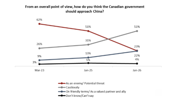 數據顯示,認為加拿大應將中國視為“敵人”或“威脅”的比例,已從2023年的62%大幅下降至23%。