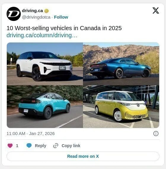 在剔除豪华品牌、已停产车型、超高价车型及销量数据不透明的特斯拉后,媒体统计出了2025年加拿大销量最低的10款车型: