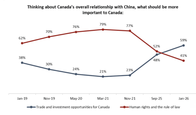 到2025年,随着特朗普关税威胁令加拿大人感到不安,这一比例几乎持平。而如今,在卡尼自2017年以来首次以总理身份访问中国之后,59%的加拿大人将经济因素放在优先位置。