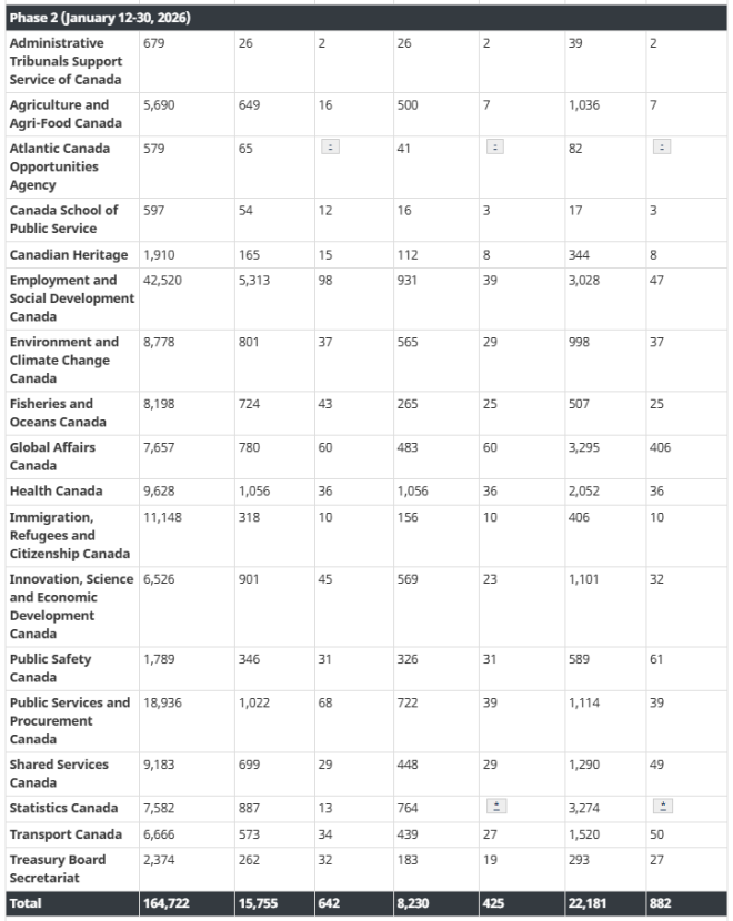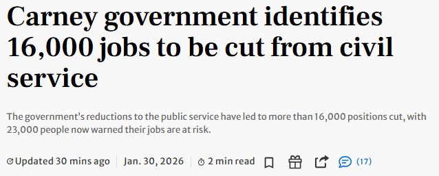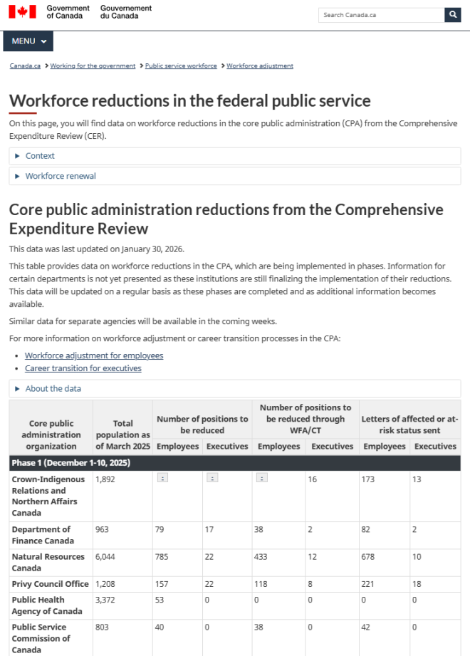 政府于周五(1月30日)上线了一个网站,详细列出了核心公共服务各部门预定裁减的职位数量。这些数据不包括国有企业或其他独立机构,由于总理马克·卡尼(Mark Carney)去年指示要求削减15%的预算,这些机构也在进行裁员。