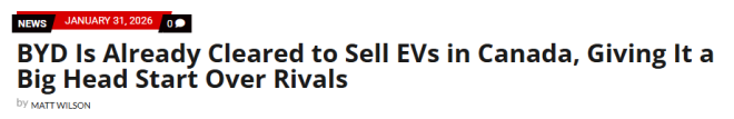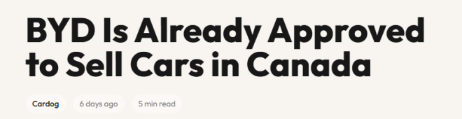 总之,只有比亚迪可以更快。一旦传闻中的关税+配额制度启动——每年允许49,000辆中国电动车,税率6.1%——比亚迪很可能会因为监管准备已经完成,而抢占更大的加拿大市场份额。
