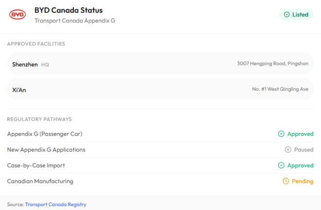 很多人以为,中国车企进入加拿大要从零开始,得花好几年走监管流程,才能实现规模化进口。但问题是,比亚迪不是“新申请者”。他们早就在名单里了。
