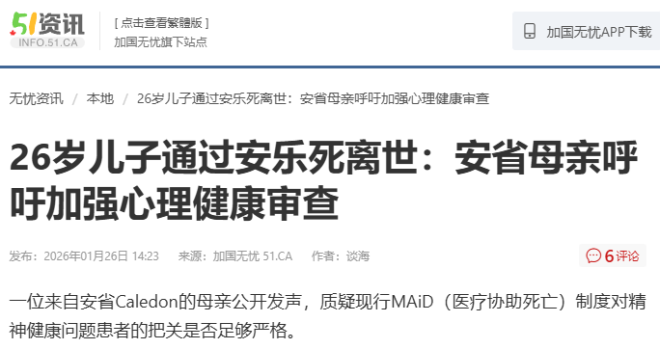 一位来自大多伦多地区、正承受巨大悲痛的母亲,正在努力追问真相:她26岁的儿子患有糖尿病,同时正经历视力丧失和抑郁症,但在家人表示他在自己所在省份被认定不符合安乐死条件的情况下,却于去年12月在卑诗省获得了医生协助死亡(MAID),并在家人不知情的情况下,结束了生命。