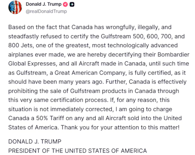 特朗普在帖子中指责渥太华“错误、非法且顽固地”拒绝认证美国产飞机。虽然部分Gulfstream机型已获得加拿大交通部批准,但仍有部分尚待审批。