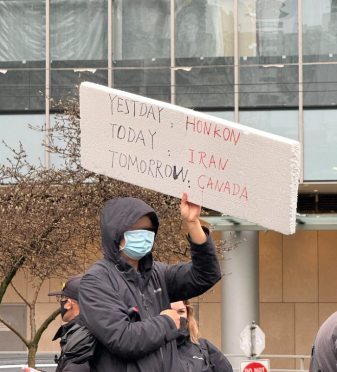 现场可见不少华裔人士参与,当中包括来自中国内地及香港的新移民。来自万锦于人村的选民现场抗议华裔议员马荣铮跳槽自由党。
