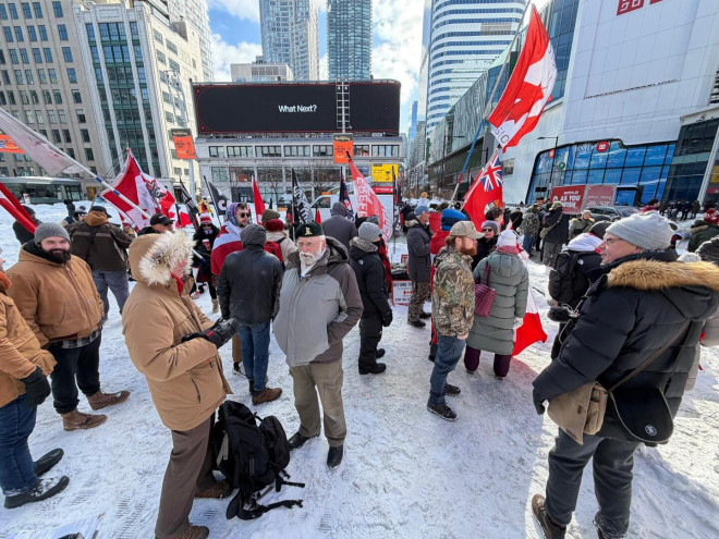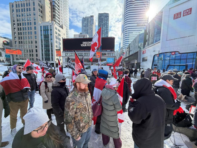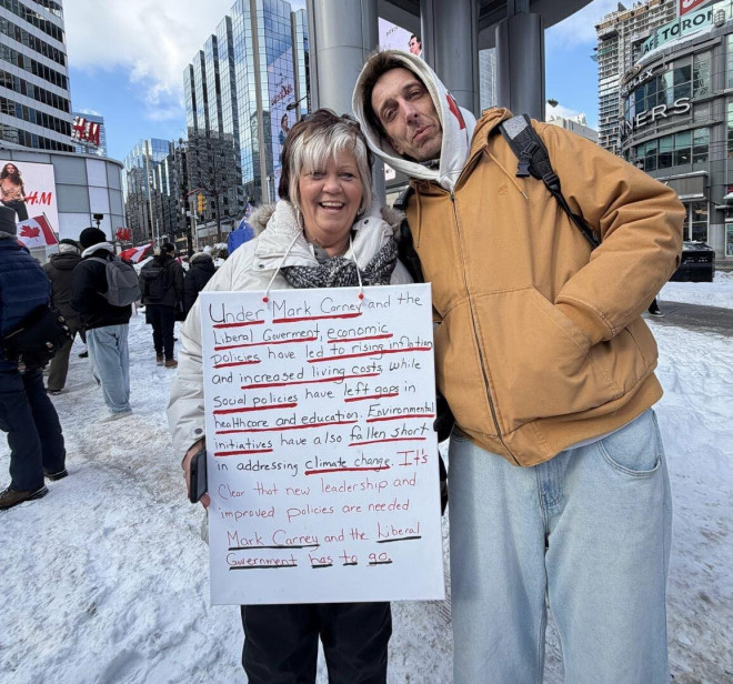 周六中午12时起,多伦多活动现场登打士广场已有近百人聚集,不少示威者自备旗帜及标语,表达对卡尼政府的不满,要求卡尼尽快下台。