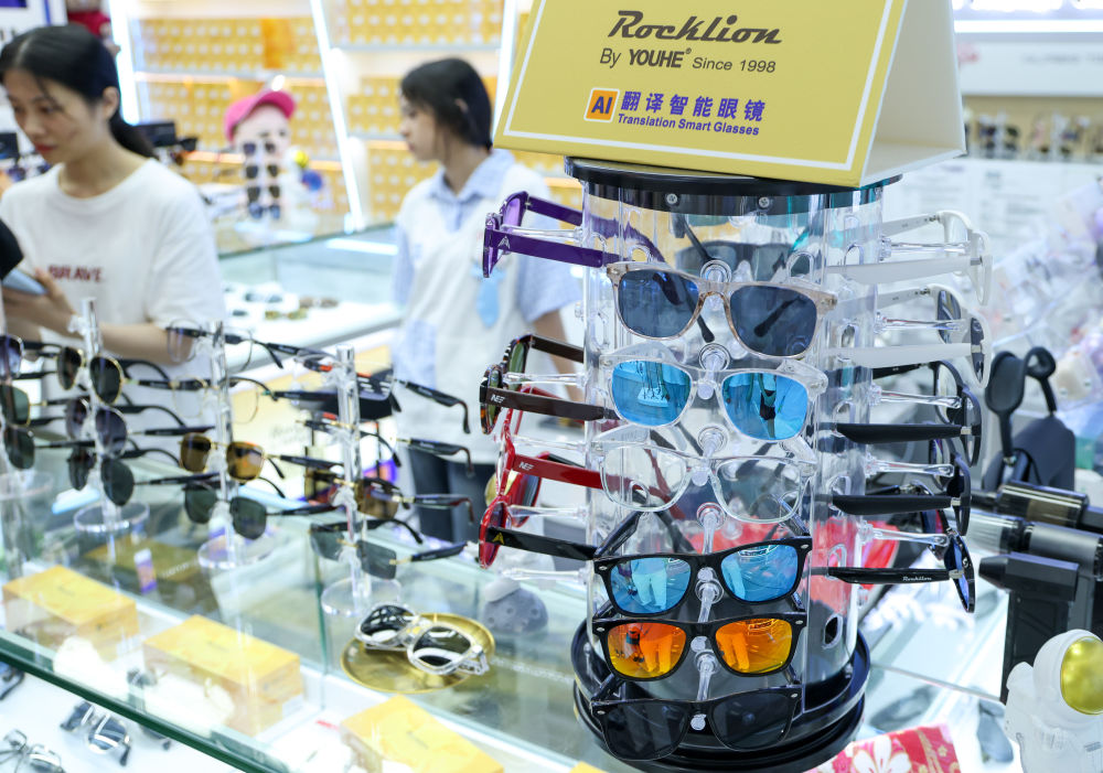 2025年7月22日,深圳华强北一家商户的柜台上摆放着不同款式的智能眼镜。新华社记者 毛思倩 摄
