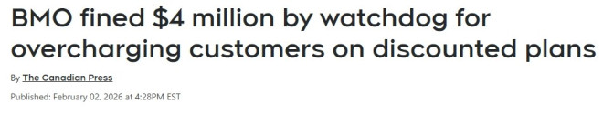 加拿大金融消费者管理局(FCAC)表示,已对蒙特利尔(BMO)处以400万加元罚款,原因是该行未能正确披露费用细节,导致向客户多收费用。