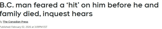 2023年卑诗省鲁珀特王子港一对夫妇及其两名年幼孩子死亡事件举行验尸调查(inquest),一名警官作证称,这位父亲曾相信自己成为了一起“买凶杀人”(hit)的目标。