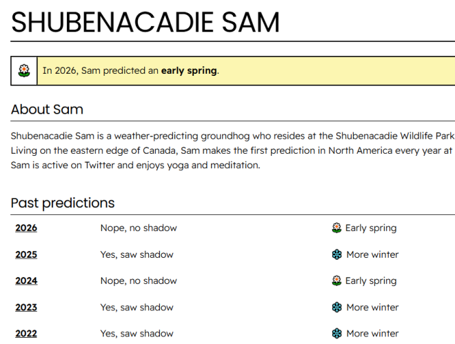 加拿大最知名的土拨鼠之一,新斯科舍省的 Shubenacadie Sam,则因原因取消了传统预测活动。省政府表示,由于预报显示将有另一场冬季风暴,吹雪可能导致前往Shubenacadie Wildlife Park(哈利法克斯以北约50公里)路况不安全,因此取消活动。省府称,由于Sam今天不会看到影子,按照民间说法,同样预示春天将提前到来。