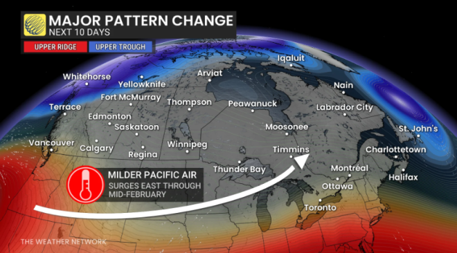 气温预计将在二月第二周迎来重大变化。阿拉斯加的阻塞高压将崩解,曾帮助极地冷空气持续涌向东加拿大的跨极流将被切断。届时,来自太平洋的温暖空气将迅速东推,覆盖加拿大大部地区。