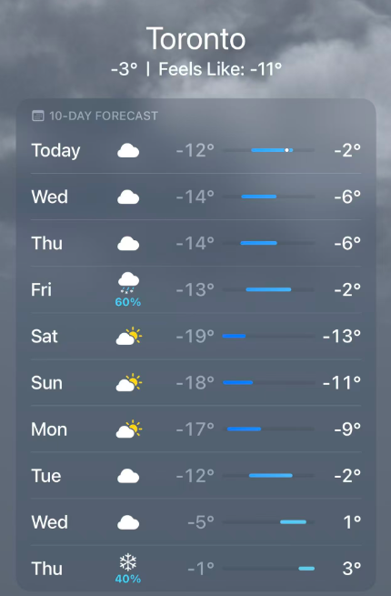 这个周末,将有新一股极地涡旋来访,部分地区温度将比季节平均低超过 15°C。多伦多气温低至-14℃,体感温度重新回到零下20多度。