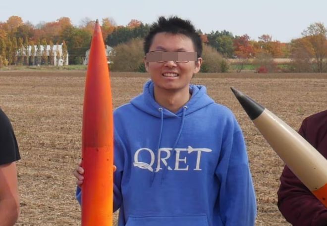 25岁的Fei(Frank)Han周一参加了远程保释听证会。视频中他戴着黑框方眼镜,与Facebook和LinkedIn等社交媒体上的照片一致。其中一张照片中,他身穿皇后大学火箭工程团队(QRET)的连帽衫,手中拿着一枚亮橙色火箭,笑容灿烂。