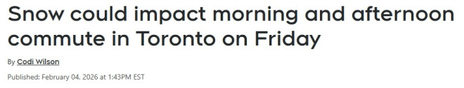 CTV多伦多专家Lyndsay Morrison表示,目前正关注一波可能到来的降雪,或将影响周五早高峰以及下午的下班通勤。“降雪量看起来不会太大,肯定无法与我们最近经历的情况相比。”