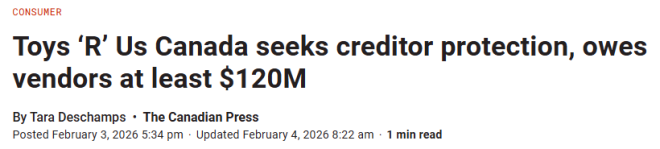 目前,加拿大玩具反斗城欠全国供应商和房东超过1.2亿加元。在截至2025年11月的10个月里,该公司亏损约1.7亿加元,远超2024年记录的5,500万加元亏损。