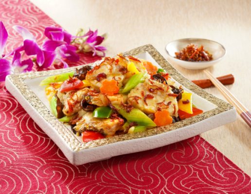 1. 龍躉肉切成塊,用廚房紙吸乾水分。加入鹽、白胡椒粉、蛋清和少許芝麻油拌勻,備用。