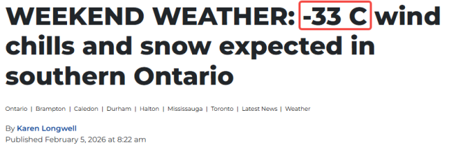 当晚,密西沙加、宾顿、伯灵顿、奥克维尔以及杜兰区将集体“冻回深冬模式”,气温将骤降至–22°C,在风寒效应影响下,夜间体感温度可能低至 –33°C。