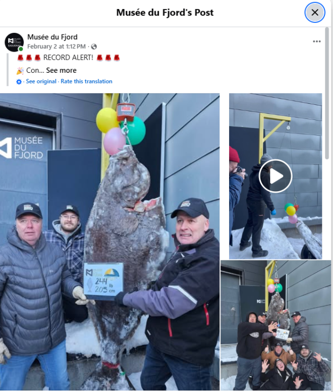 上周六,周六,一名魁北克冰钓者花了两个半小时才在Saguenay Fjord 钓出一条重达244磅的比目鱼。