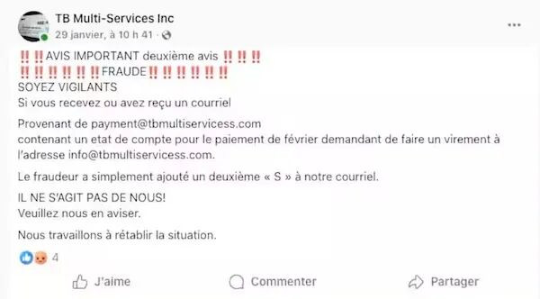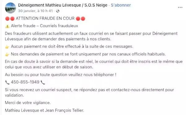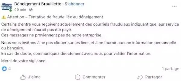 过去一周,来自莱维斯(Lévis)、圣雅辛特(Saint-Hyacinthe)、希库蒂米(Chicoutimi)、布谢维尔(Boucherville)等地40多家除雪公司负责人先后报警,称有骗子冒充他们向客户发送“未付款提醒”电子邮件。
