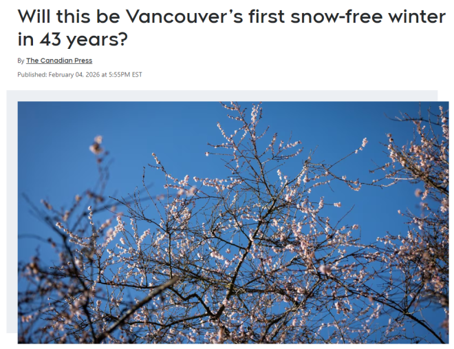 截至目前,温哥华国际机场(YVR)气象站仍未正式记录到任何降雪。这也意味着,如果接下来几周情况不变,温哥华有可能迎来自 1982—1983 年冬季以来,整整 43 年里的第一个“无雪冬天”