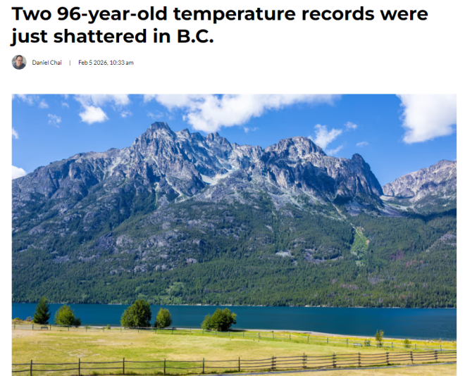 根据加拿大环境与气候变化部(ECCC)发布的数据,截至 2 月 4 日晚上 11:11,BC 省至少 15 个地区刷新或追平当日历史高温纪录
