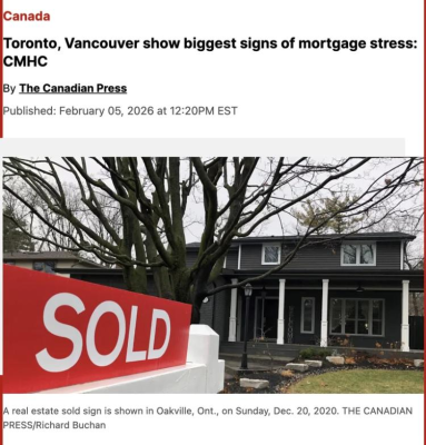 加拿大抵押貸款與住房公司(Canada Mortgage and Housing Corp.,簡稱 CMHC)表示,在多倫多和溫哥華,房主正顯現出財務壓力跡象,預計未按時償還房貸的情況將持續上升。