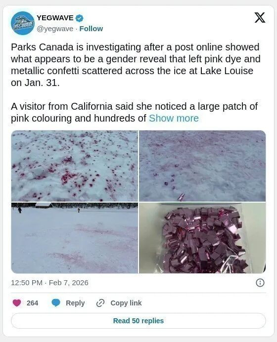 不过,Reddit一则帖子曝光1月31日路易斯湖(Lake Louise)冰面上疑似举办一场“性别揭晓派对”,留下大片粉色染料和金属亮片,严重破坏自然环境。