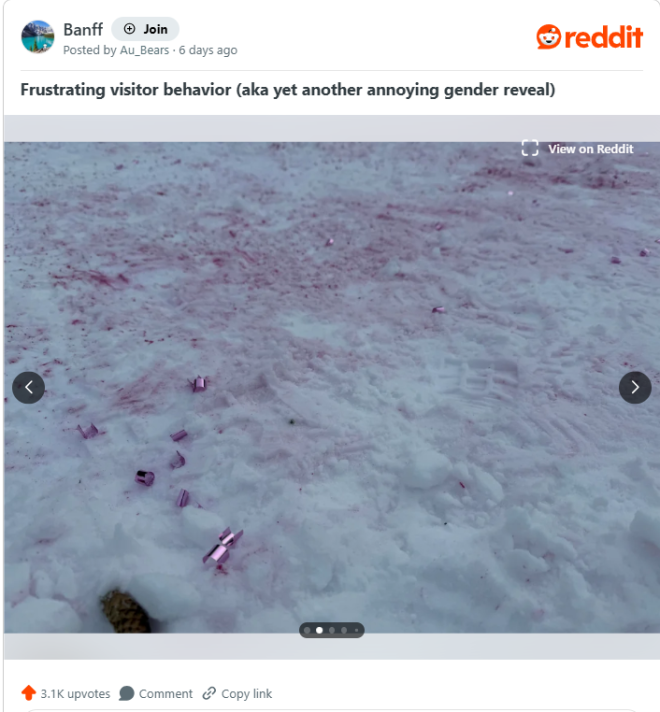 不過,Reddit一則帖子曝光1月31日路易斯湖(Lake Louise)冰面上疑似舉辦一場“性別揭曉派對”,留下大片粉色染料和金屬亮片,嚴重破壞自然環境。