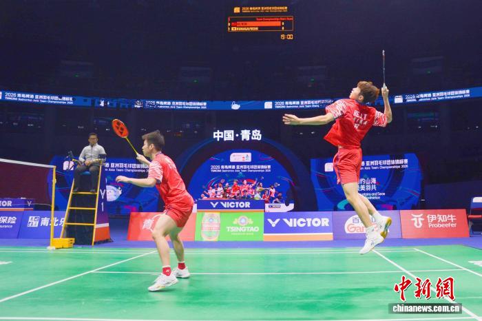 2月8日,中国羽毛球男队不敌日本队,收获2026年亚团赛亚军。图为中国组合何济霆/任翔宇在比赛中。张孝鹏 摄