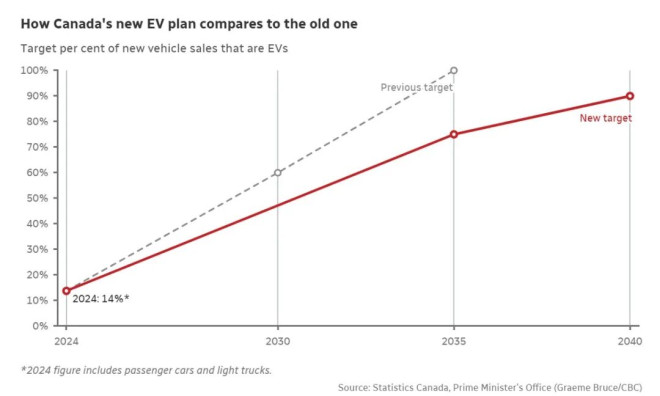 卡尼表示,即便没有强制销售比例要求,政府依然预计,到 2035 年,电动车将占到加拿大新车销量的 75%。