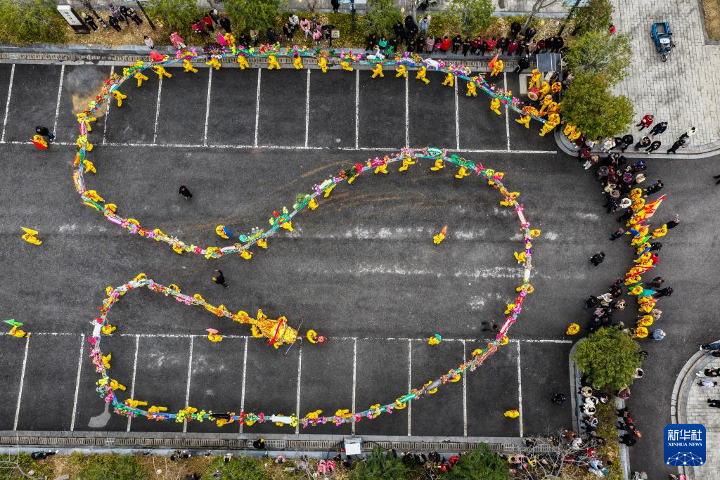 2月10日,诸暨市赵家镇赵家社区村民抬着板凳龙在镇综合文化站广场上舞动(无人机照片)。