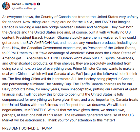 总统唐纳德·威胁称,如果美国没有得到他所称的“充分补偿”,他将阻止戈尔迪·豪国际桥(Gordie Howe International Bridge)的开通——这条新建的重要贸易通道将连接温莎(Windsor)和底特律(Detroit)。