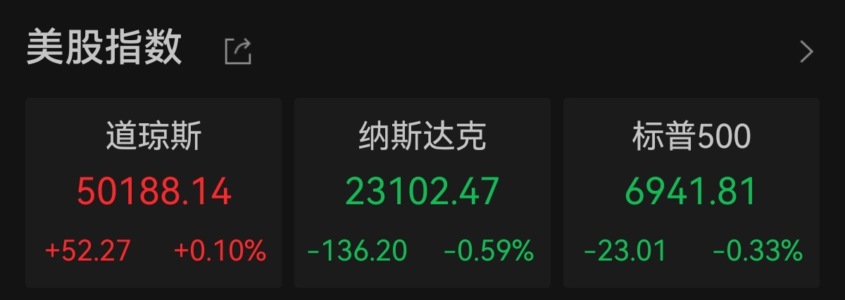 截至当天收盘,道琼斯工业平均指数比前一交易日上涨52.27点,收于50188.14点,涨幅为0.10%;标准普尔500种股票指数下跌23.01点,收于6941.81点,跌幅为0.33%;纳斯达克综合指数下跌136.20点,收于23102.48点,跌幅为0.59%。