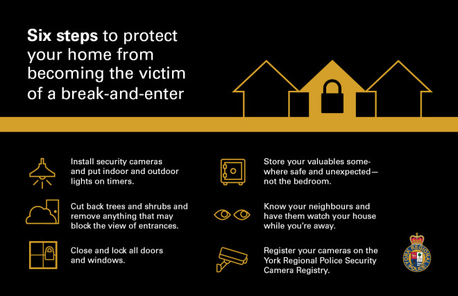 约克区警察局提醒公众,务必保持住宅“有人居住”的外观。警方建议居民遵循六项防范措施(上图),以降低住宅遭入室盗窃的风险。