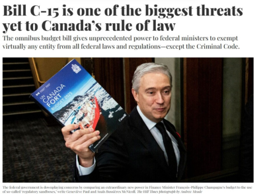 批評人士稱,法案中的一項關鍵條款將賦予聯邦部長前所未有的權力,在最長六年內豁免個人、企業或機構遵守幾乎所有聯邦法律和法規,僅《刑法》除外,對加拿大法治原則構成嚴重威脅。