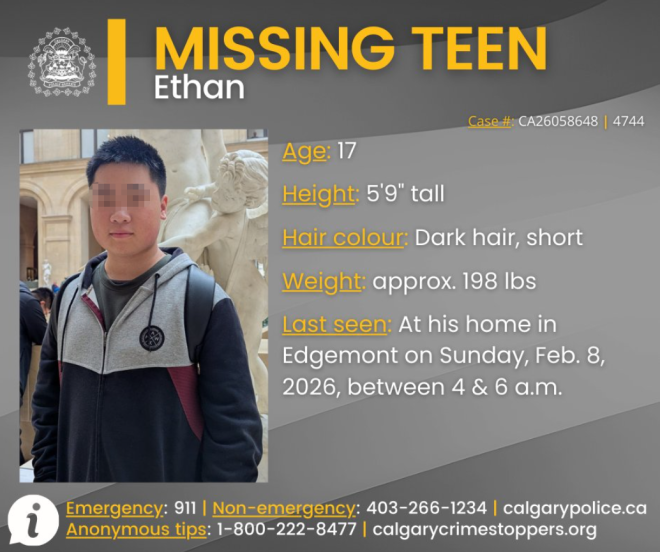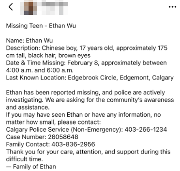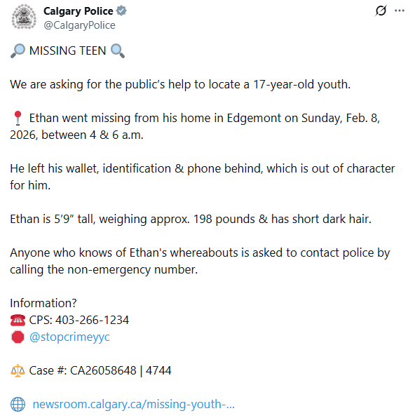 2026年2月8日,卡尔加里警察局(Calgary Police Service)发布公开寻人通告,寻找17岁的Ethan。他居住在卡尔加里西北部Edgemont社区,于当天凌晨4点至6点之间从家中失踪。警方表示,在接到报案后,已对他的安全状况表示高度关注。