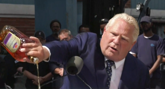 去年9月,福特在新闻发布会上将整瓶Crown Royal威士忌倒在地上,以抗议Diageo关闭Amherstburg工厂的决定。
