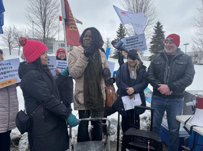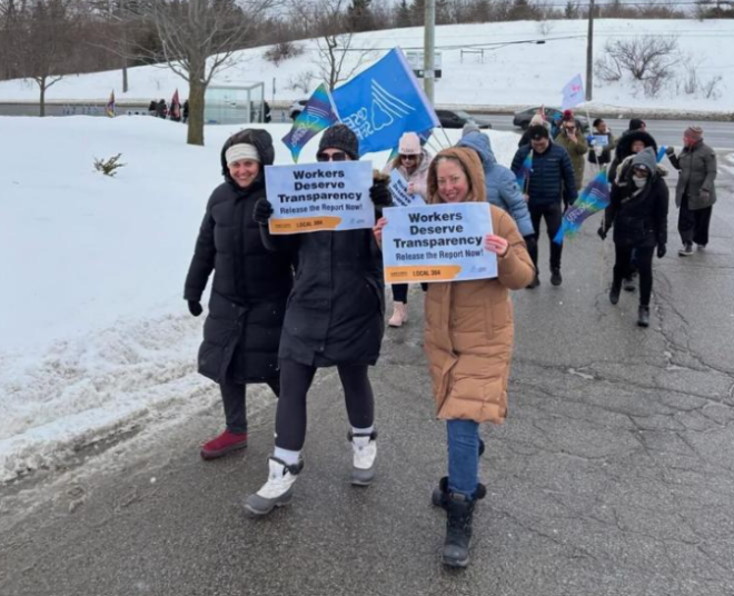 同一天,OPSEU Local 304工会成员在Newmarket总部外举行集会,抗议所谓“有毒的工作环境”,并要求董事会公布由Agree Inc.进行的最新职场评估报告结果。
