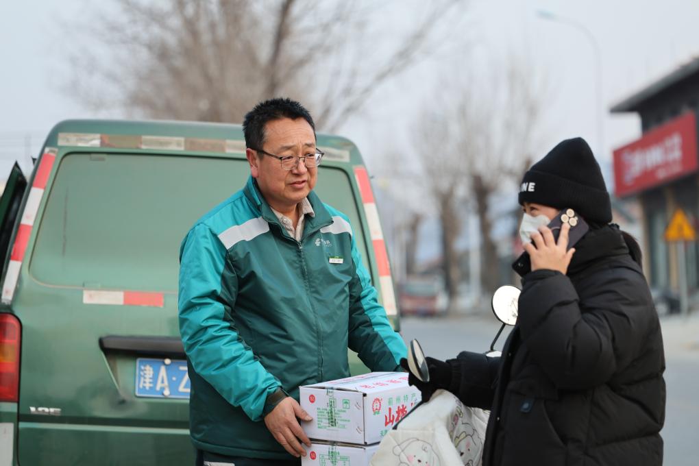 那是一辆墨绿色的邮政车,驾驶员为投递员刘大方,车里满载着天津市蓟州区下营镇百姓的年货。
