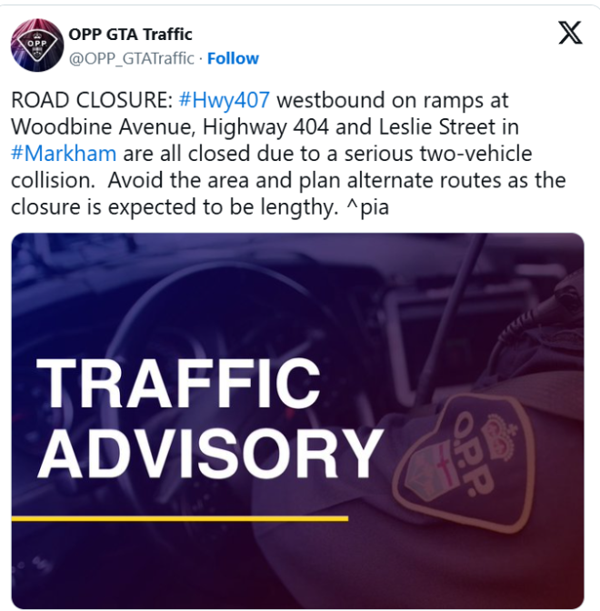 为进行调查,407号高速西行方向在Woodbine Avenue、404号高速以及Leslie Street的入口匝道全部关闭。