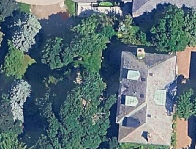房屋被金属围栏和成排的树木环绕,拥有两个街道门牌:北侧设有车道和带门禁的人行入口,南侧设有两个车位的车库和通往住宅的石阶。