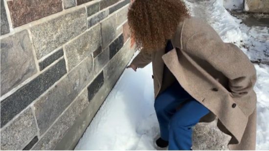 「花崗岩牆面損壞得很厲害,你可以看到鏟雪車刮出的刮痕、碎磚和鏽跡,」她指著樓上的痕跡說。