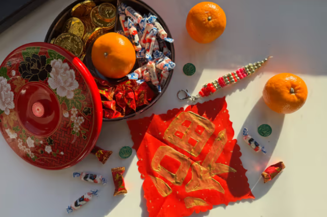 其他寓意吉祥的食物包括饺子(象征财富)、长寿面(象征长寿)、杏仁饼(象征兴旺),以及鲜艳的橙子或柑橘——它们金黄的颜色和圆润的形状都象征好运。