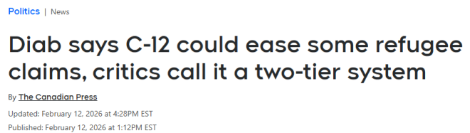 C-12号法案(Bill C-12)拟规定:凡是在一年多前首次进入加拿大的人,将不能再向加拿大主要难民审理机构——移民与难民委员会(Immigrant and Refugee Board,简称IRB)——提出难民申请。