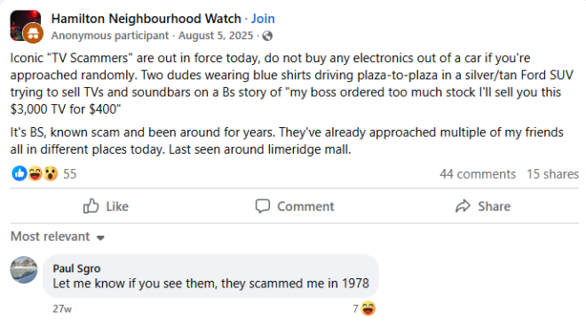在一个多伦多Facebook群组的讨论下,有网友调侃:“看到他们记得告诉我——他们1978年就骗过我了。”