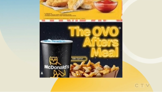上周五(2月13日),加拿大麦当劳在Instagram上发布了一段视频。视频中出现了Drake创立的服装品牌October’s Very Own(OVO)标志性猫头鹰图案,其上叠加了麦当劳的logo。下方还能看到标语“Where night owls land”(熬夜党落脚点),以及“coming 2.17”(2月17日推出)的字样。